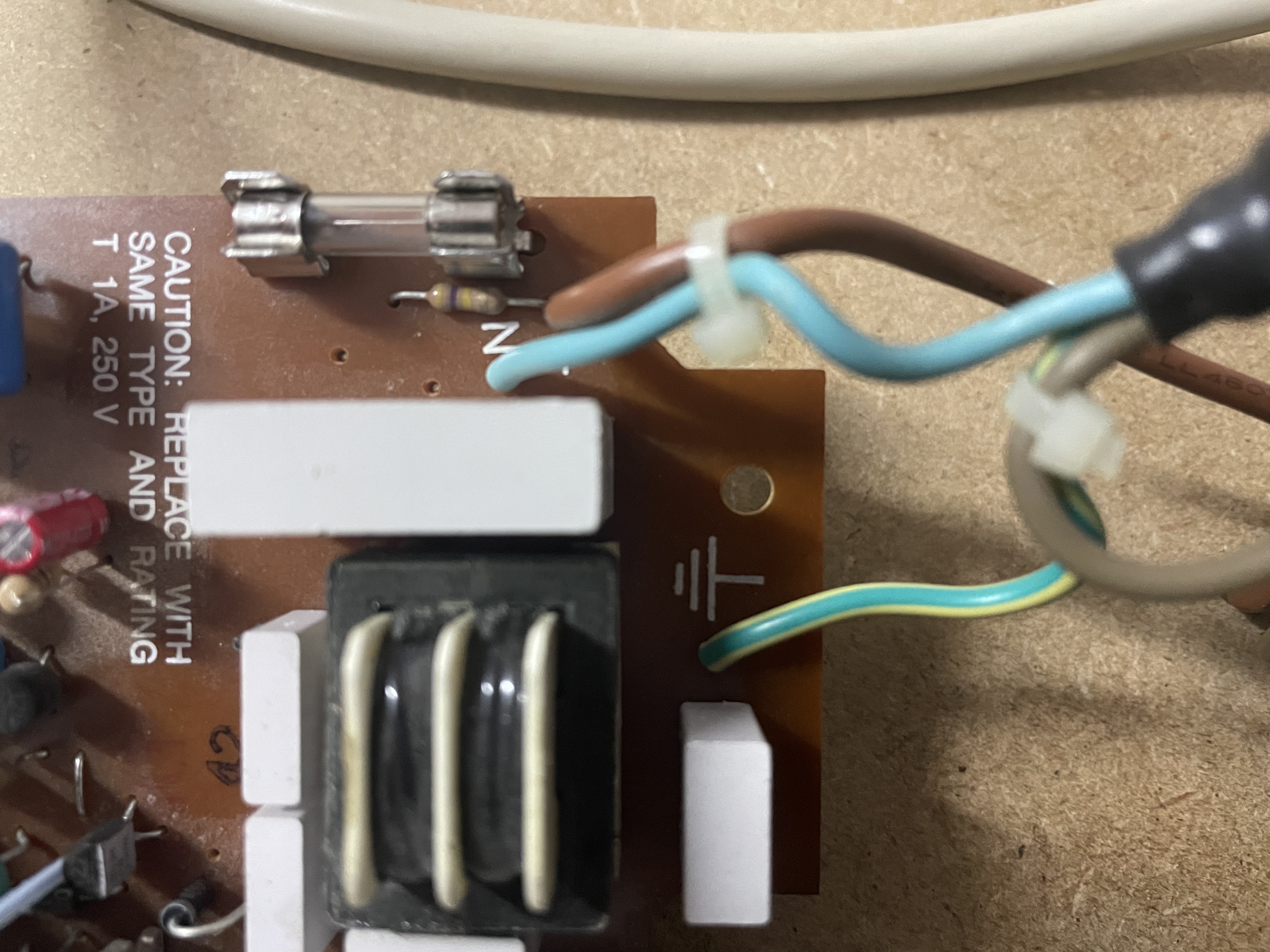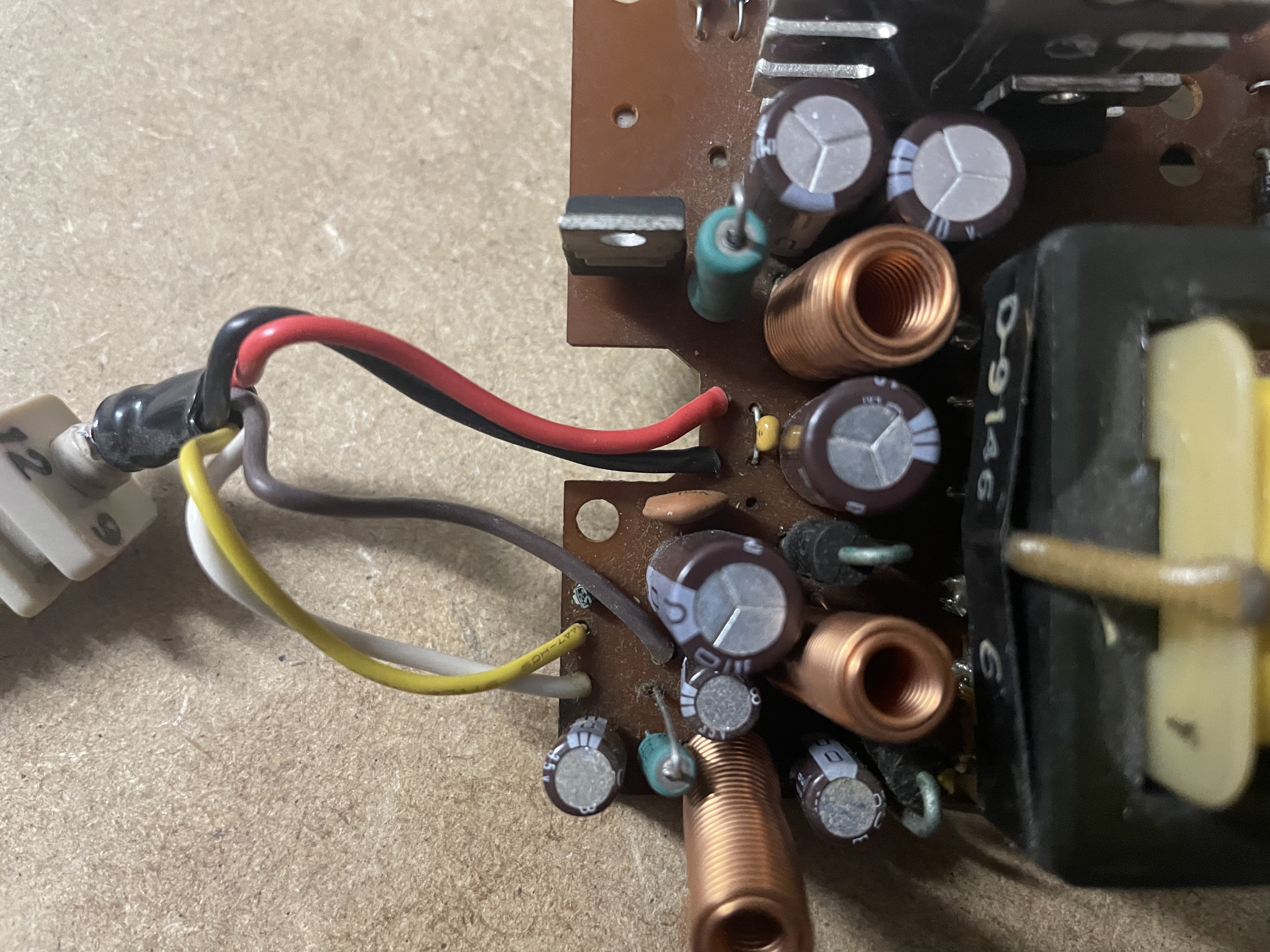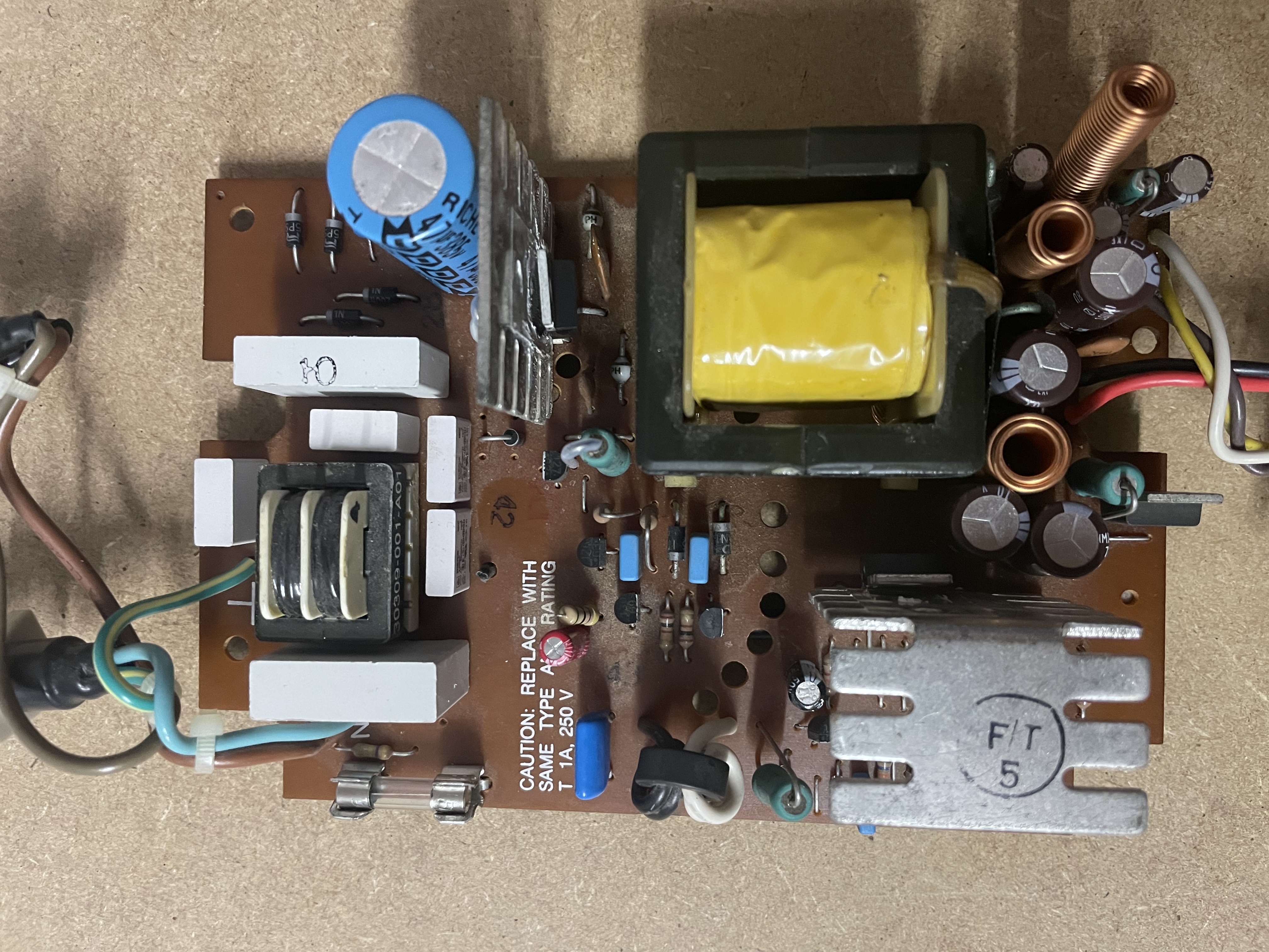 Forgot to put two resistors back for front photo. From the diode (between AC caps and vertical heatsink) towards the big cap: 1.5 and 0.5 ohms. |